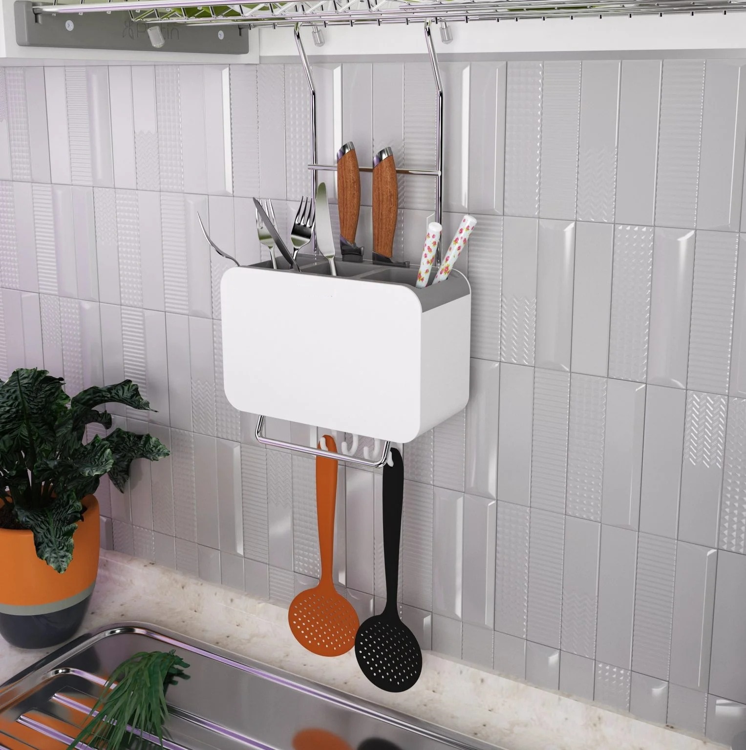 نحوه استفاده: این محصول بهصورت آویزی طراحی شده است، که این امکان را به شما میدهد تا آن را از هر جایی مانند آبچکان آویزان کرده و قاشقها، چنگالها و چاقو های خود را در دسترس و مرتب نگه دارید. همراه با این محصول 3 عدد قلاب آویزی نیز ارائه می شود که با استفاده از آن می توانید در قسمت زیرین جا قاشقی سایز ابزار و وسایل مانند پوست کن، در باز کن، چای صاف کن و ... را آویزان کنید